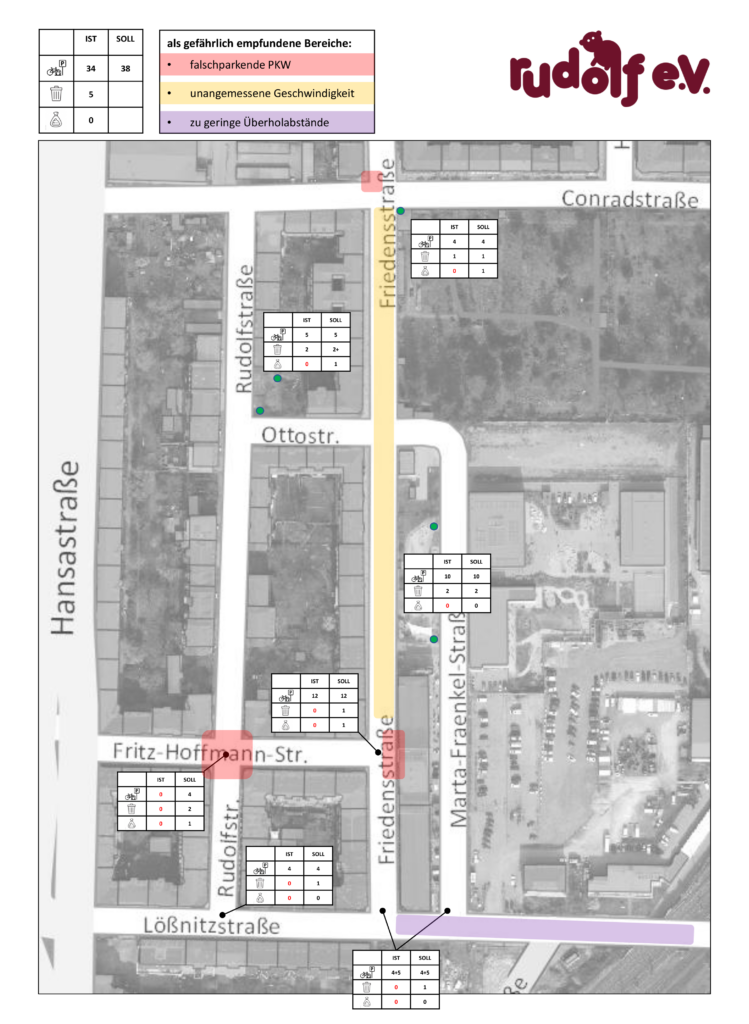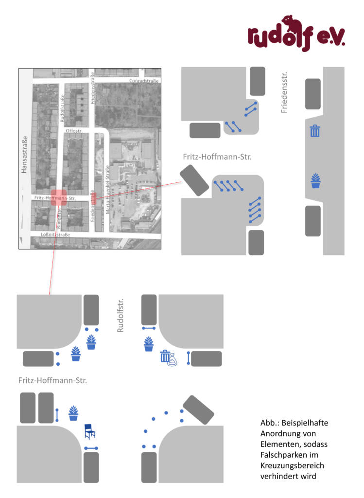 - Gefährdung schwacher Verkehrsteilnehmer:innen durch Falschparken im Kreuzungsbereich, unangemessene Geschwindigkeit und zu geringe Überholabstände (siehe Skizze)